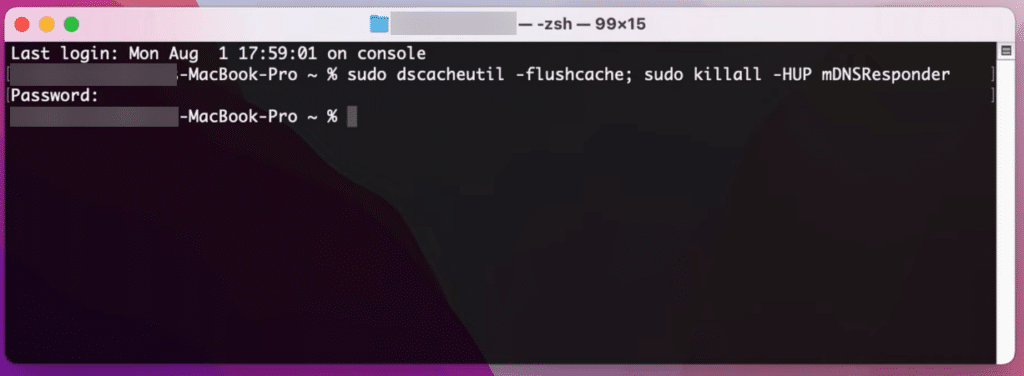 4. Enter your macOS’s password, which will be invisible, and press enter to confirm clearing out of the DNS.
